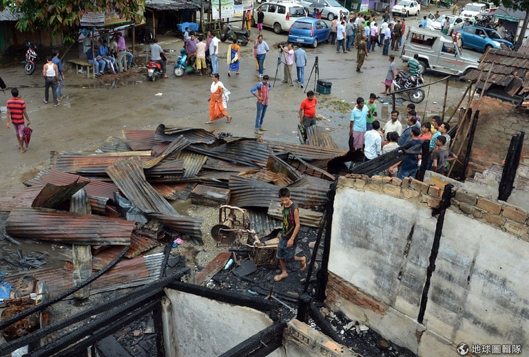 人們看著剛剛遭到攻擊的市集。報導指出,印度東北阿薩姆省(Assam)一座城鎮的繁忙市場遭穿軍服的 3到4名槍手大開殺戒,槍殺 12人並射傷另 15人。當局把這起攻擊歸咎於地區分離主義團體。
