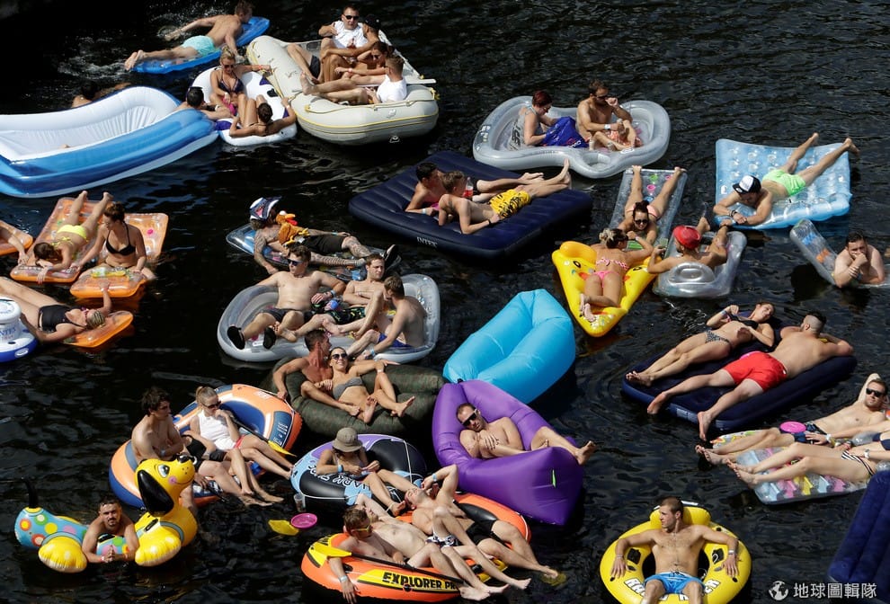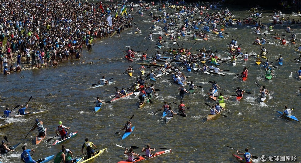 赫日梅日笛采(Hrimezdice)當地,民眾正在橡膠船中等待遠處舉辦跳崖競賽開跑。
