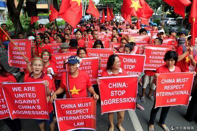 馬尼拉的中國大使館前,菲律賓和越南民眾集結,他們高舉標語「中國必須尊重國際法」,表達對中國政府強悍佔領南海海域的不滿。