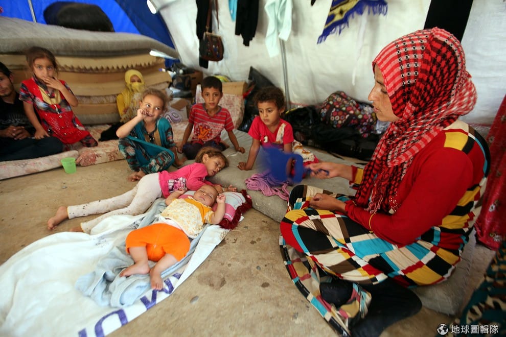摩蘇爾當地,逃離伊斯蘭國戰火的人們正在難民營中休息。