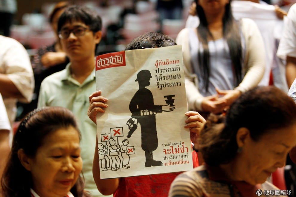 抗議新憲法的活動人士舉著海報,外界批判這次的公投會賦予泰國軍方更多權力。