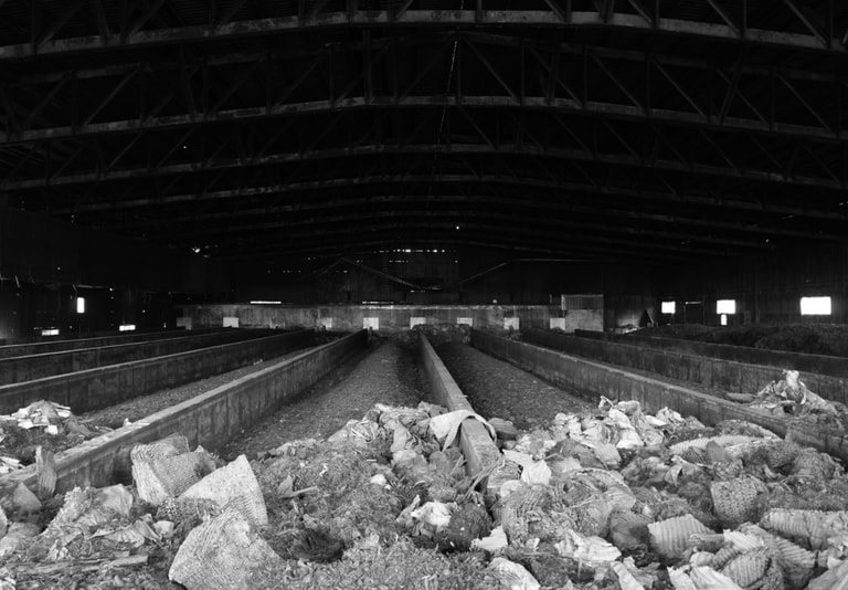 走入其中一間「堆肥精製廠」,裡頭昏暗渾濁,只有幾道微弱光源從窗戶透隙進來,隱藏著一股遠古神秘的味道,有一部約兩層樓高的機器像化石般屹立著,沿著樓梯小心地爬上去,上面佈滿了一層厚厚泥土,踩在上面能感覺稍微陷下去的軟度;旁邊另有一間室內面積最大的「發酵廠」,八槽的發酵槽內堆滿了垃圾,凌亂不堪,原本在槽上的大型翻堆機已消失蹤影,其它的「人工分選室」、「副料添加處」、「快速混合發酵槽」、「維修廠」內部皆空無一物。