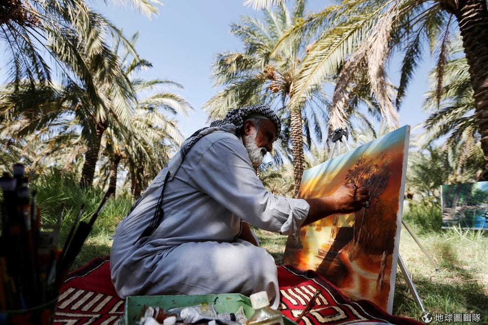 54歲的阿爾格雷巴威(Kareem Nasir Al-Ghreibawi)曾是一位農夫,之後轉職成了一名畫家,圖中的他正在伊拉克庫特市(Kut)的農地中作畫,他多以當地的傳統生活為題,受到來自世界各地包括美國人的歡迎。
