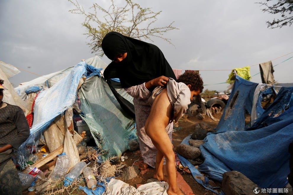 沙那當地設立的難民營中,女子對記者秀出孩子身上的皮膚病。