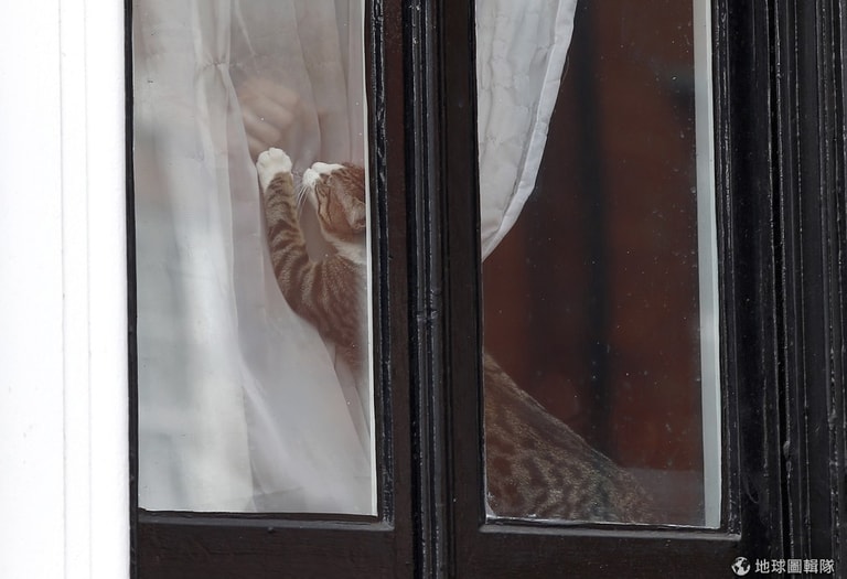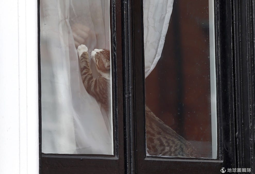 倫敦的厄瓜多大使館裡,2012年6月就開始住在此的維基解密(WikiLeaks)創辦人阿桑奇(Julian Assange),他新養的小貓正在屋內玩耍。不久前,阿桑奇的小孩送來這隻貓咪陪伴他,讓他在大使館裡的生活不會太寂寞。