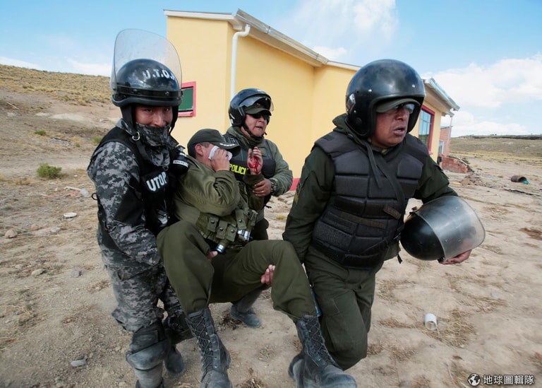拉巴斯的礦工與警方發生衝突,照片中可見警察受傷被抬至安全地方。