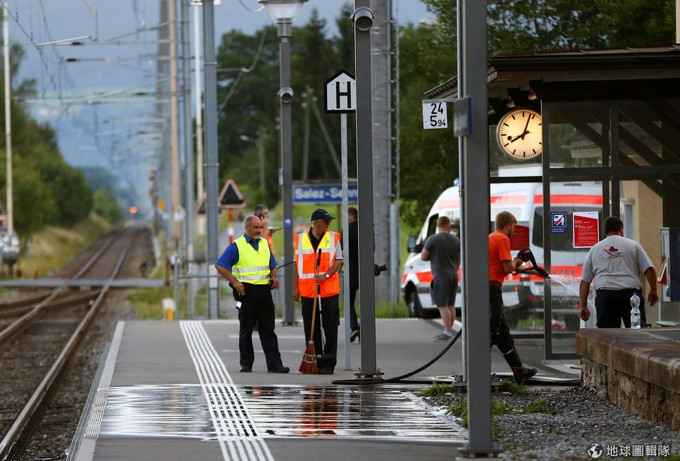 員警正在瑞士東北部的火車站清理案發現場。13號時,一名 27歲男子在火車上縱火,隨後拿刀砍人,造成車上乘客一死六傷,兇手也在犯案中受傷,送醫後不治。目前警方尚未查出兇手的犯案動機。