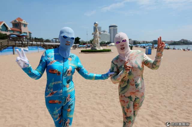 在山東省青島,害怕太陽又想享受海灘時光的女子穿上「臉基尼」(facekini),這是一種只露出雙眼、鼻子和嘴巴的游泳裝備,頗受怕晒的女性歡迎。
