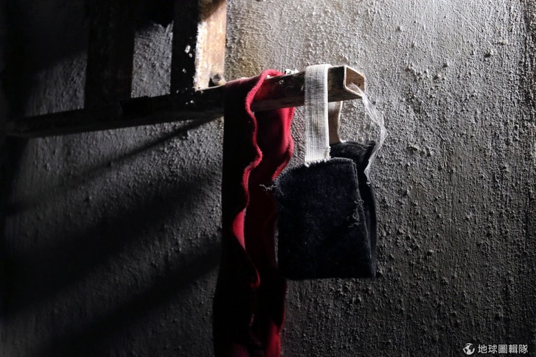 敘利亞民主力量(Democratic Forces of Syria)軍人在伊斯蘭國(IS)留下的監獄裡,發現了用來遮住犯人雙眼的眼罩。