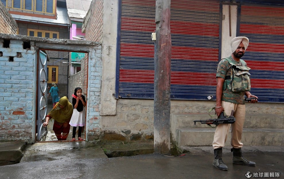 一名小女孩看著站在門外的印度軍警,她所在的位置是印度西北邊的斯利那加市(Srinagar),該地位置敏感,處於備受爭議的查謨-克什米爾邦(Jammu)內。近日,當地分離主義分子和政府發生一連串衝突,當局除了增派武裝部隊入駐,還宣布實施宵禁,讓生活在斯利那加市的人民越來越不安。