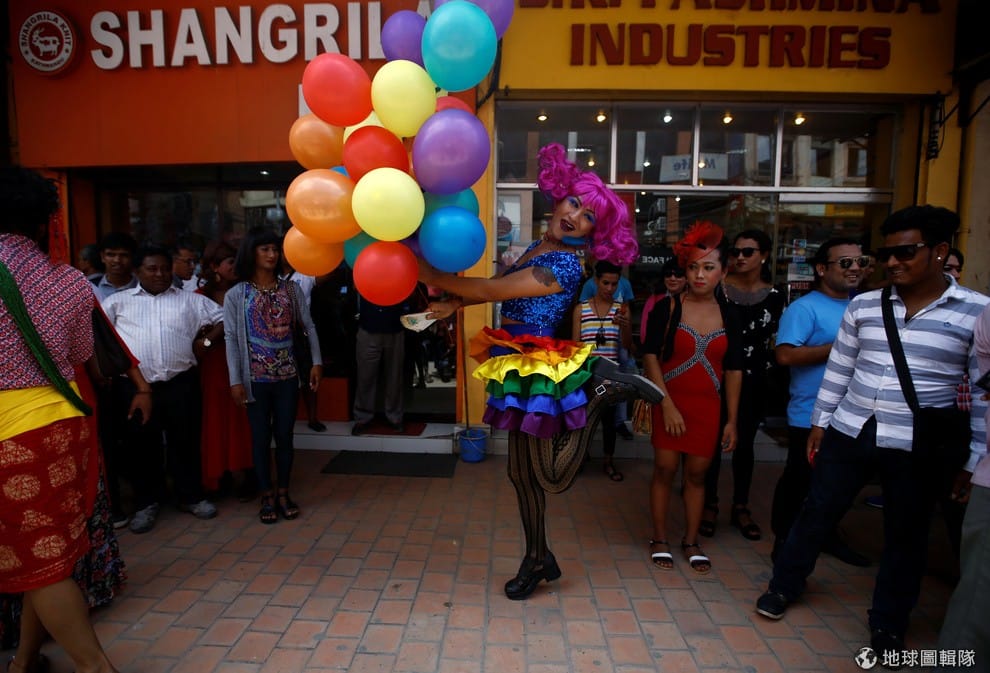 參加LGBT大遊行的民眾穿上彩虹裙,拿著五顏六色的氣球在出發前留影。