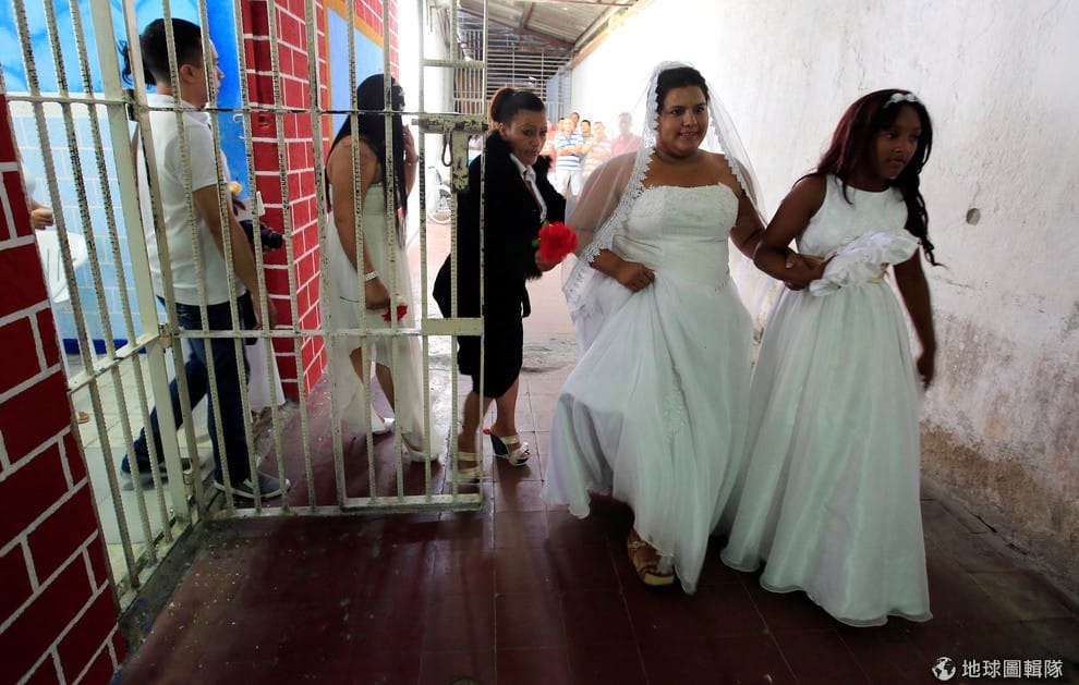 一名女子穿上白紗,在左右伴娘的攙扶下進入監獄,和在獄內的未婚夫完婚。