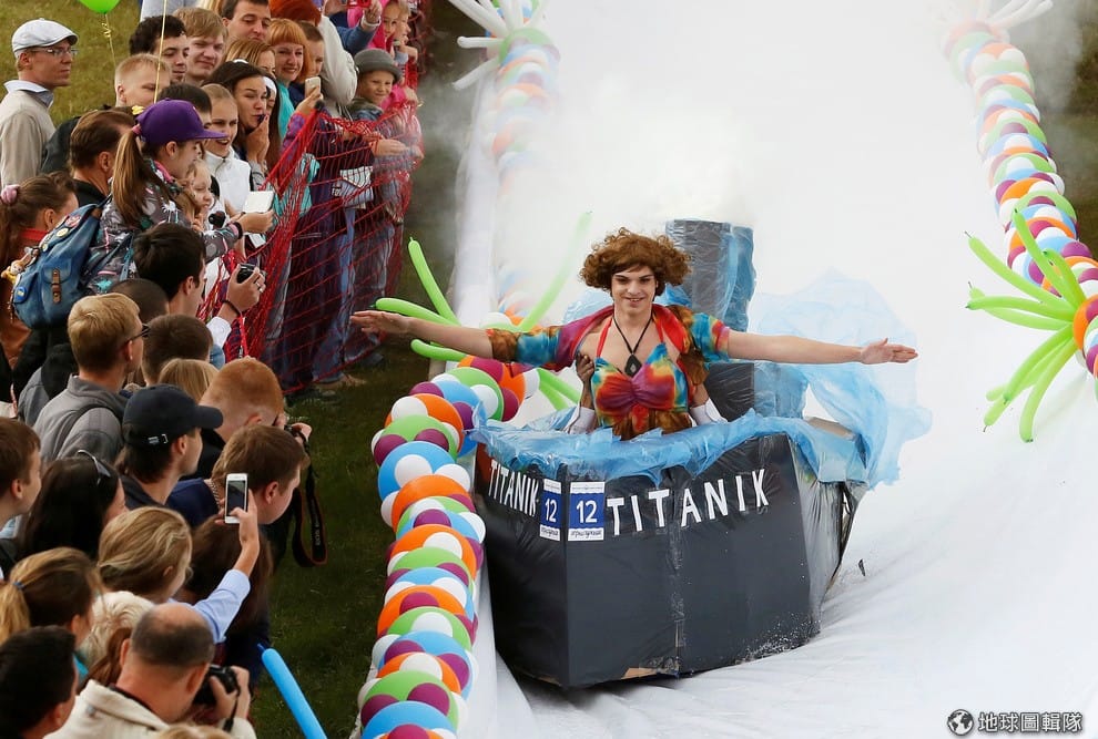 21號這天,參加夏日滑水節的民眾發揮創意,把自己的泳圈添上五花八門的主題,其中,有人把自己打扮成電影《鐵達尼號》的女主角蘿絲,一路滑下水道濺起一朵朵水花。