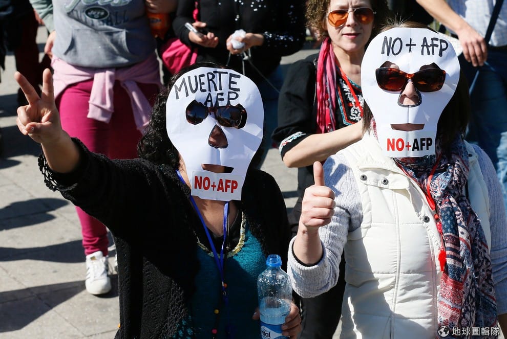 不滿國家退休基金制度的民眾,帶上自製的骷髏頭面具上街抗議,他們的面具上寫著「退休基金官員(AFP)去死」等字樣。