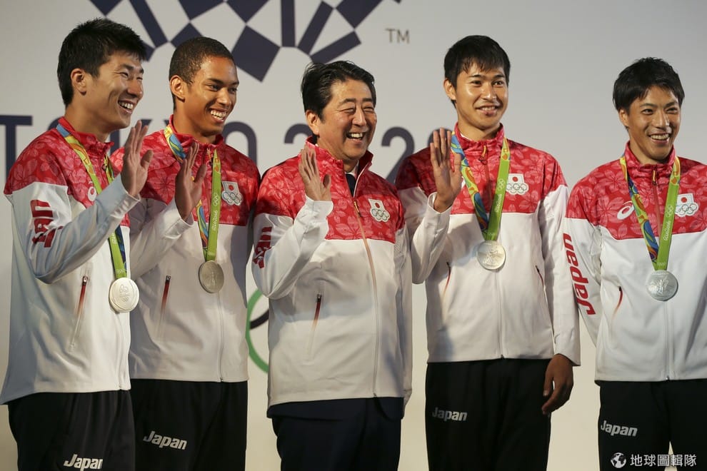 日本首相安倍晉三(圖中)來到里約選手村,和在奧運中獲獎的體操國手見面。