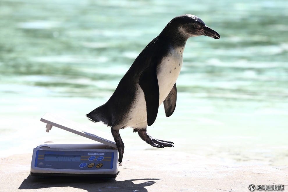 在倫敦動物園內,一隻量完體重的漢波德企鵝( Humboldt penguin)跳下磅秤,牠剛結束一年一度的身體檢查。