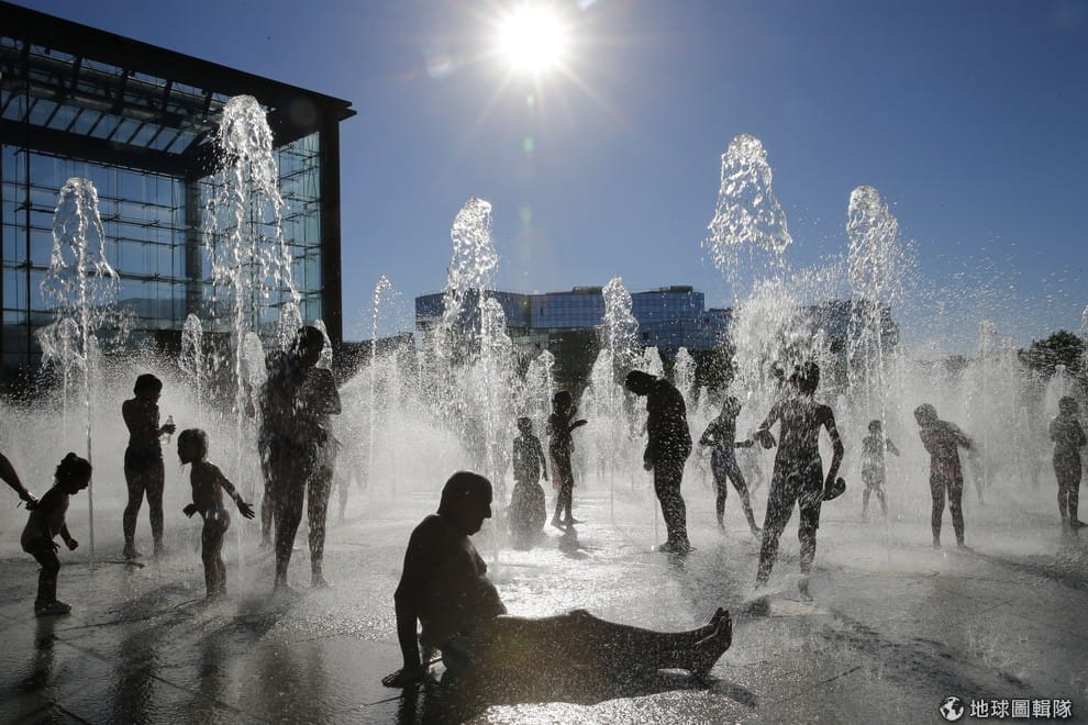 在巴黎的噴泉公園內,大人小孩開心地玩水消暑,抵擋巴黎不斷飆升的高溫。