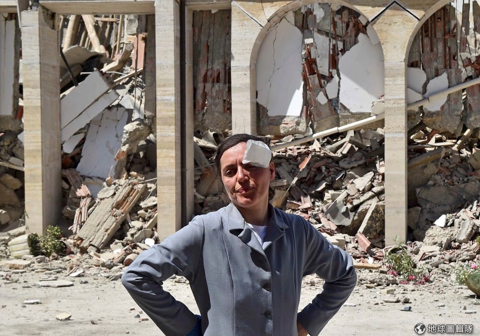 一名女子頭頂著紗布,站在遭芮氏規模 6.2的強震震毀的建物前。24號這天,義大利中部山區遭強震重創,造成至少 159人死亡,368人受傷,災區成了一座鬼城。受創嚴重的阿馬特里塞市(Amatrice)市長皮洛茲(Sergio Pirozzi)說:「半個鎮都不見了!」