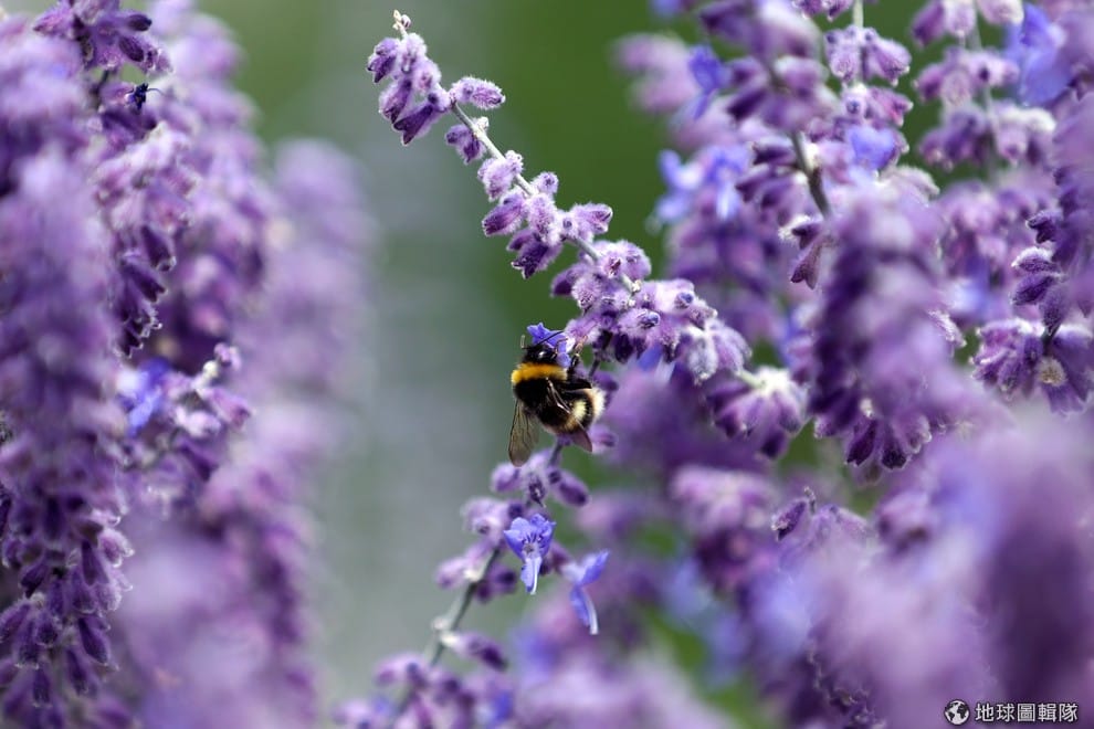 一名蜜蜂享受著薰衣草香甜的花蜜。