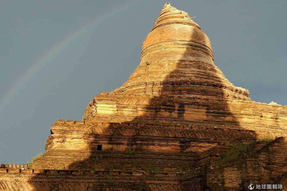 一道彩虹出現在一座受地震重創的寶塔旁。24號下午五點,緬甸中部發生芮氏規模 6.8強震,造成至少 3人死亡,68座佛塔遭毀。
