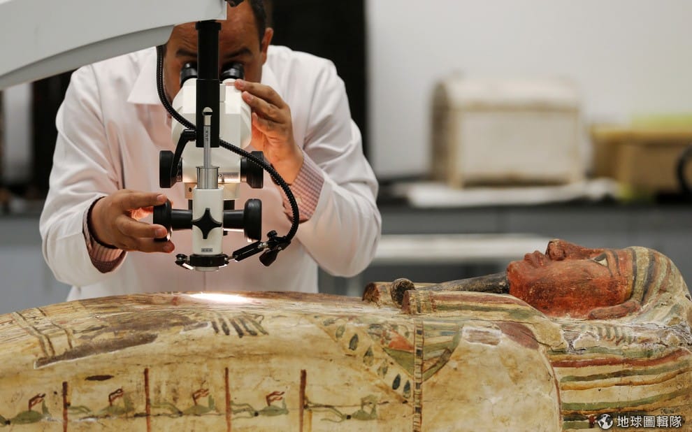 考古學家阿卜杜拉(Medhat Abdallah)用顯微鏡專心地檢視大埃及博物館收藏的木乃伊棺木。