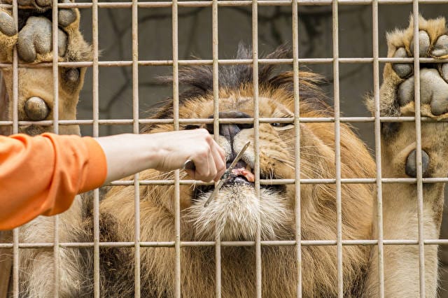 大牟田市立動物園的飼育員以食物訓練獅子張嘴接受口腔檢查。 取自:日本雅虎新聞特集