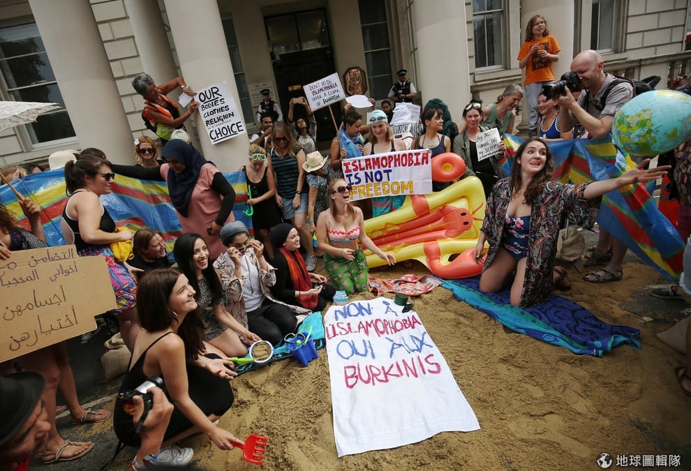 一群運動人士來到倫敦法國大使館前抗議,他們不滿日前法警強制要求穆斯林婦女不可以穿著布基尼(burkini)下水,法國當局認為女性把全身包住,只露出臉部和手腳前端,形同將自己隔離起來,就像全臉面紗一樣不該在公共場合穿戴,對整體社會有不良影響。