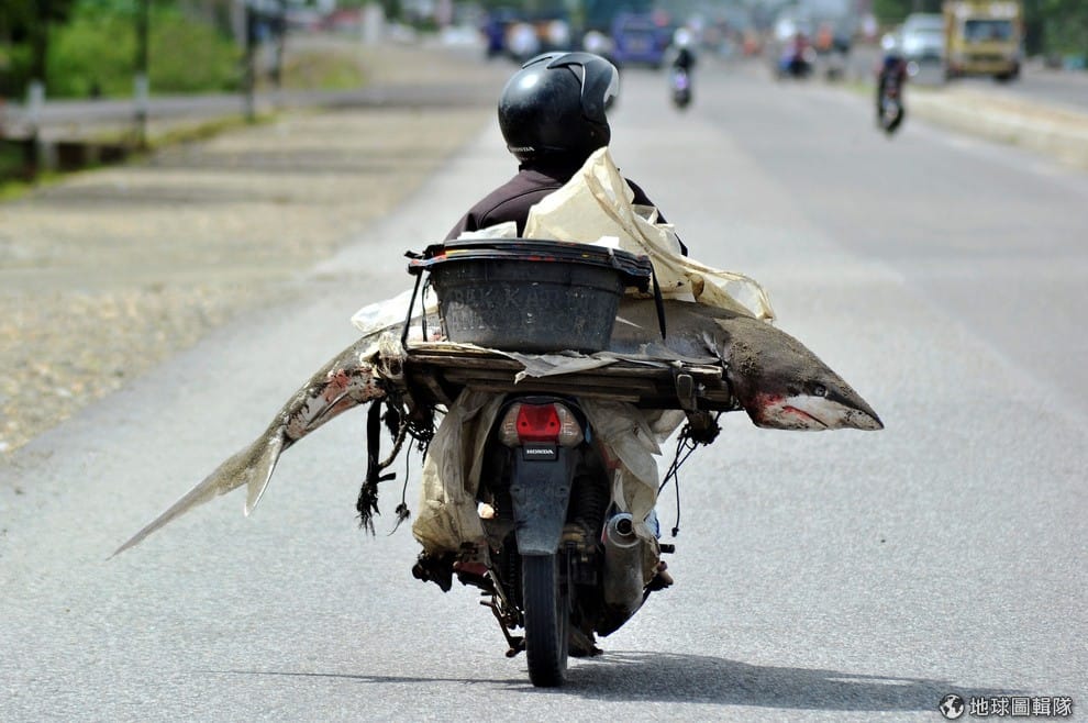 一名漁夫把捕到的鯊魚往機車後座一放,開心地騎車回家。