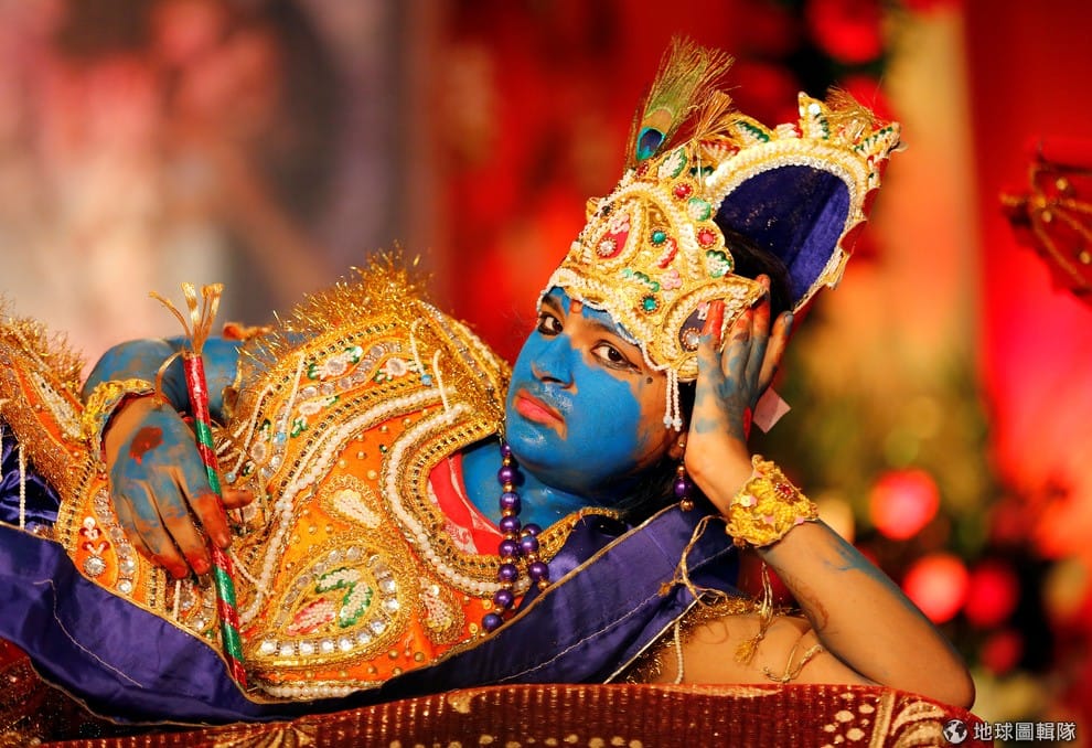 一名女孩把臉塗成藍色,穿上印度教傳統服飾,打扮成黑天神慶祝祂的生日。根據《維基百科》,印度黑天神是印度教中至高無上的神明,祂通常會以穿著黃色布褲,頭上帶著孔雀羽毛,吹著牧笛的牧童形象出現,有時,祂的身旁會有妻子的陪伴或被一群年輕美女圍繞,身邊也常出現孔雀、牛和蛇等動物。