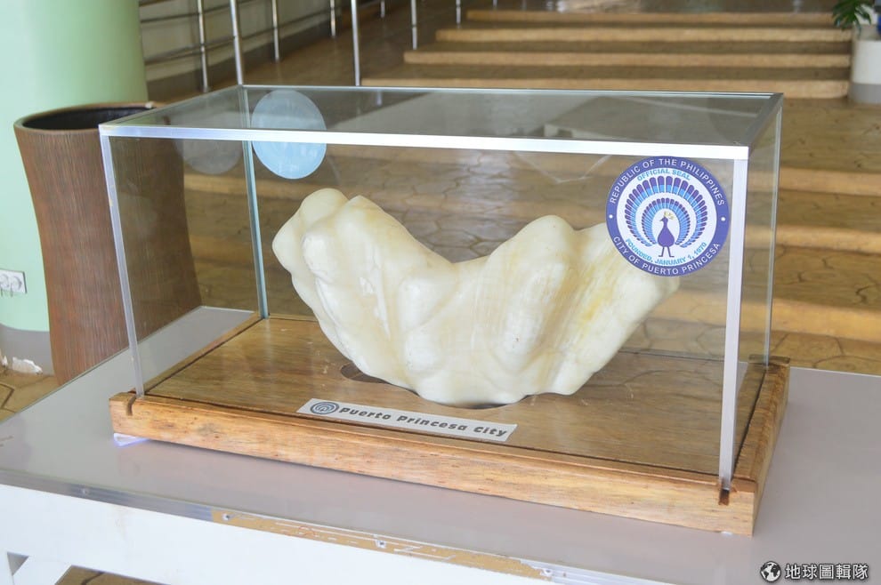 在巴拉望島上,市府人員把近日發現的大珍珠放在透明展示櫃中,供媒體拍攝,這顆珍珠重達 34公斤,是目前全球發現最大的珍珠。經過鑑定後,該珍珠的價值高達新台幣 32億元,受到全世界關注。