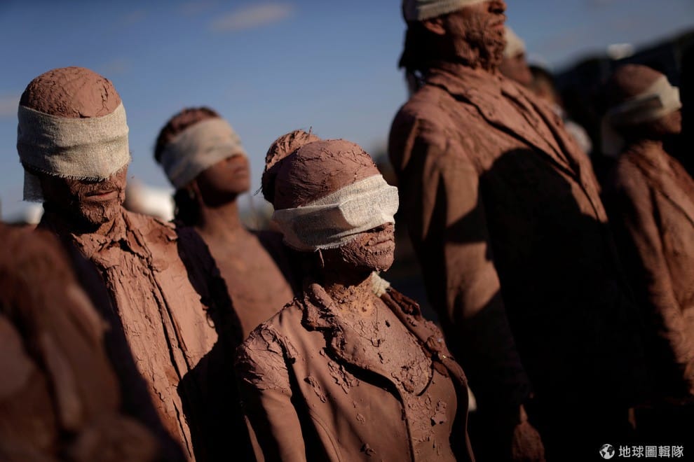 25號這天,在首都巴西利亞一群藝術家把自己打扮成褐色的泥人,戴上眼罩出現在街上,這是他們名為「盲人」的街頭行動藝術。