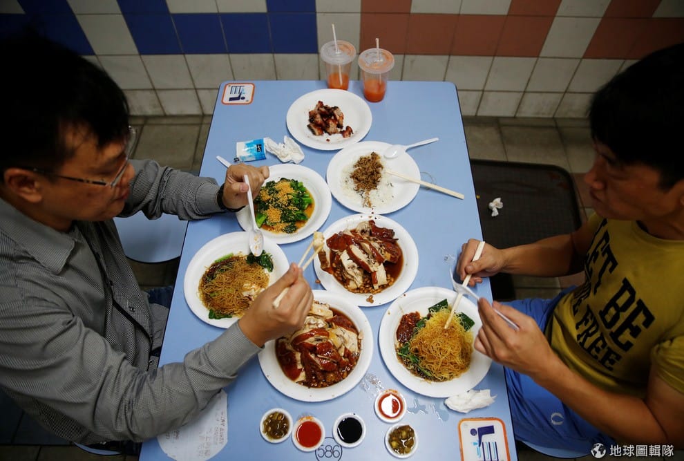 兩名饕客在新加坡唐人街食物城內,品嚐榮獲米其林肯定的醬油雞肉麵。