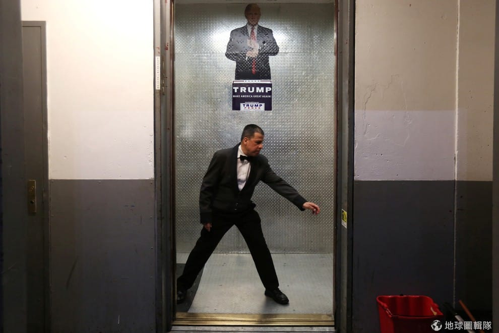 在紐約川普大樓的地下室內,一名工作人員將電梯關上,電梯內貼有美國共和黨總統參選人川普(Donald Trump)的競選海報。