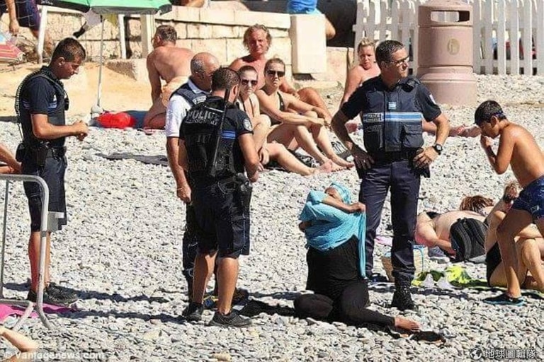 - 法國的許多地方正面臨恐怖攻擊的威脅,在這種情況還穿著具有明顯宗教色彩的海灘服裝,必須為擾亂公共秩序負上法律責任。