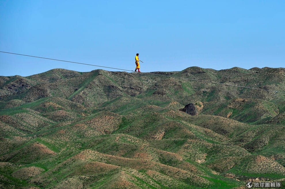 在中國的寧夏回族自治區,一名男子正在山區間走鋼索。