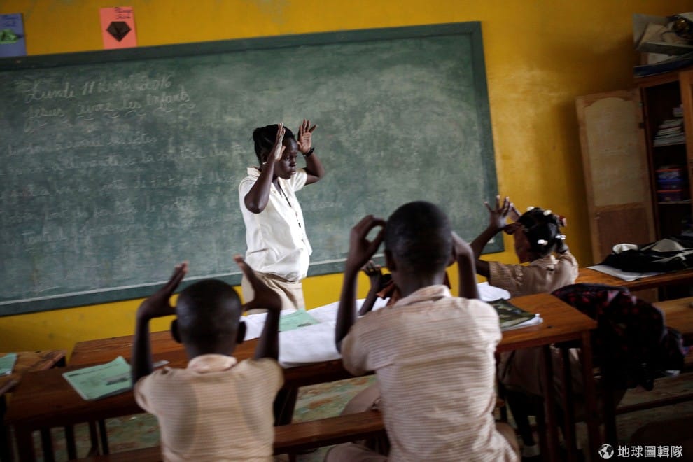 在海地港萊維克(Leveque)的「建立希望小學」(Mission de L'Espoir school),老師正在教聽障學生克里奧爾語(Creole)的手語該如何使用。