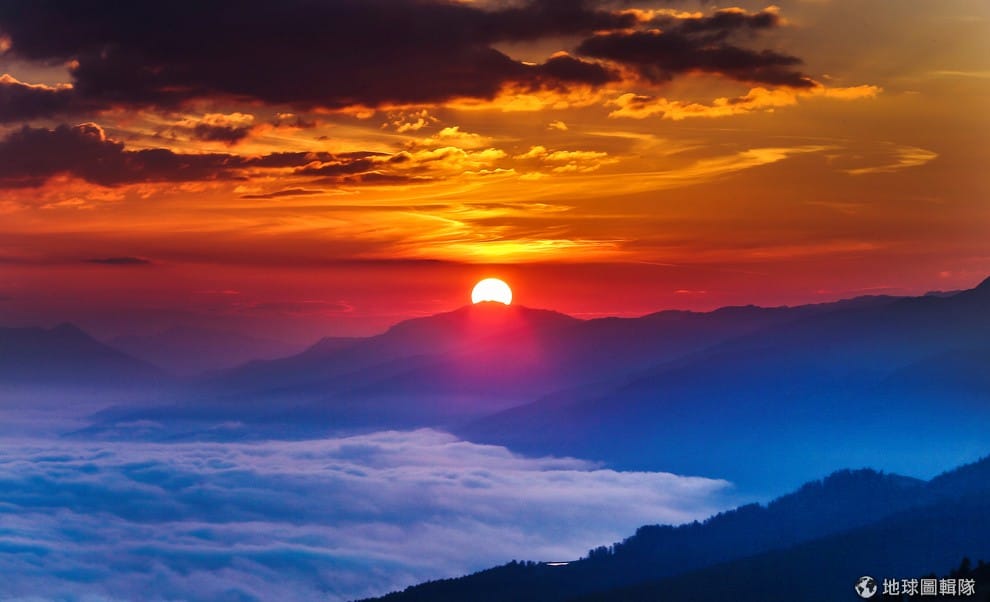 在濃霧籠罩的因河河谷(Inntal valley),日出緩緩從山的另一頭升起,映照出來的彩霞也完美地渲染於雲層之中。