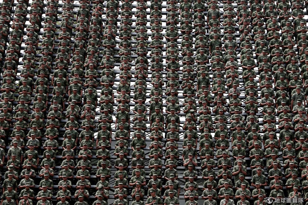 在墨西哥市,軍人們整齊劃一地坐在看台前方。
