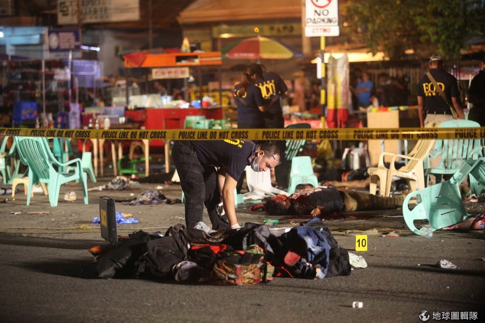 菲律賓達沃市(Davao City)在 2號發生爆炸案,起碼有 14人死亡,數十人受傷。菲律賓總統杜特蒂(Rodrigo Duterte)也在爆炸發生後趕往達沃市。圖中的警察正在調查事發現場。