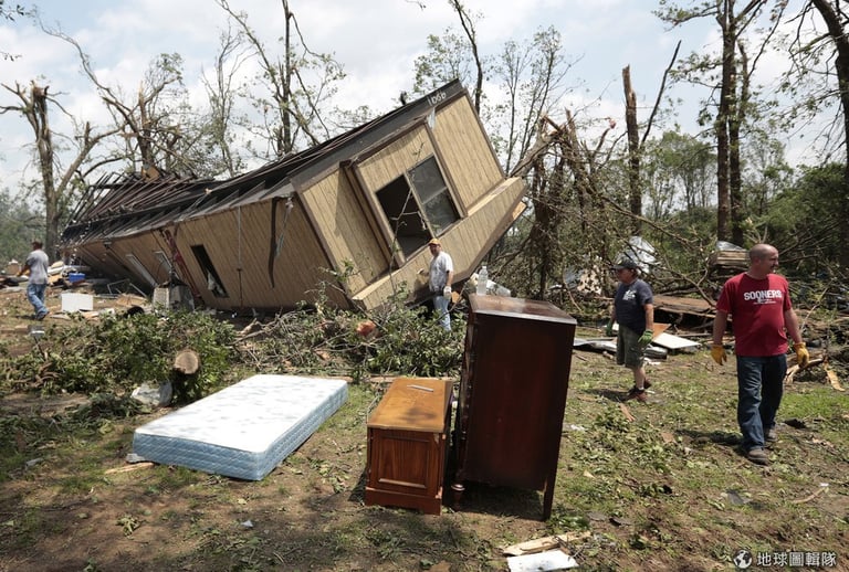 受到重創的塔樓廣場小學(Plaza Towers Elementary School),校舍的屋頂完全被吹毀,整座學校只剩下殘餘的建物骨架,有民眾在龍捲風襲擊後趕緊進入救援,將被壓在磚瓦下的學童緊急拉出救治。CNN21號報導中更新提到,有7名孩童不幸喪生,其中幾位孩童是受困在地下室中溺斃身亡。照片中是當地正在互相幫忙、清理家園的居民。Brett Deering/Getty Images