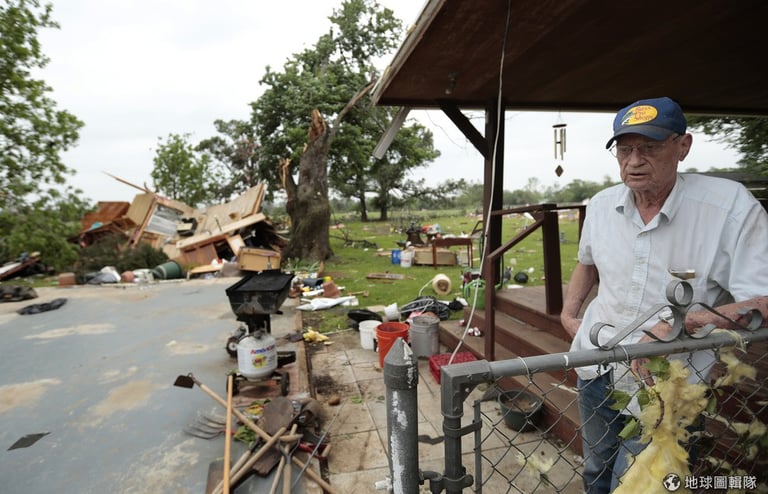 照片中的藍斯頓(Lonnie Langston)先生神情茫然地對攝影師描述他的車庫被吹毀消失了。Brett Deering/Getty Images