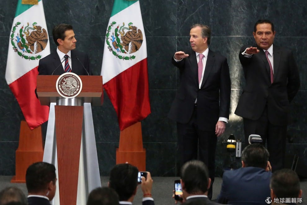 墨西哥新就任的財務部長米德(Jose Antonio Meade)與社會發展部長那瓦(Luis Enrique Miranda Nava)在總統府的就職典禮上舉手宣示。