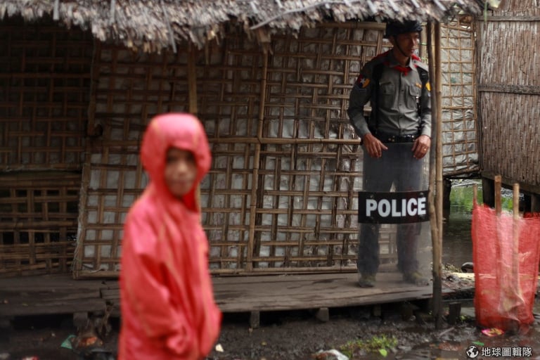 聯合國前秘書長安南(Kofi Annan)前往位在緬甸若開邦首都實兌(Sittwe)的洛興雅人(Rohingya)難民營(IDP),拜訪當地領導者,一名警衛正在門口站哨。