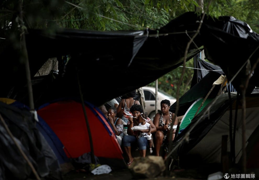 非洲移民在設立於哥斯大黎加與尼加拉瓜邊境的臨時帳棚內吃東西。