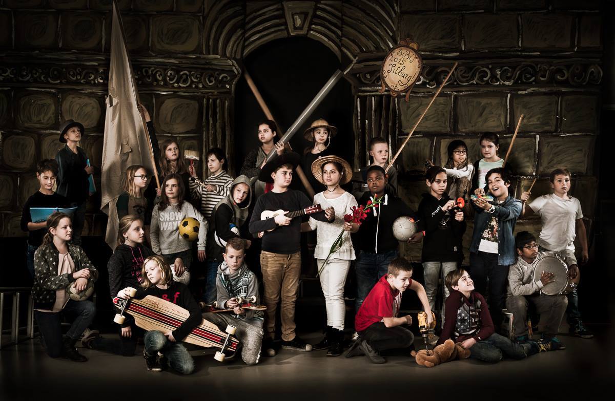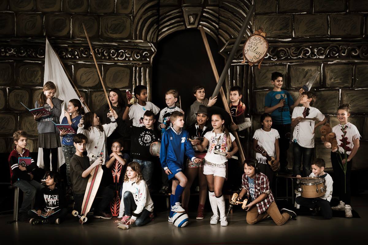 為什麼要解釋林布蘭畫作與攝影的關係呢?因為接下來要看的就是經典名畫如何走進荷蘭小學裡?荷蘭南部小學De Bibit(Tilburg)請來攝影師Krijn Westerburgen,召集全班學生以時裝入境,並以體育、知識、勞力、藝術、音樂為主題,拍張具有林布蘭風格的團體照,化被動為主動讓小朋友自己走進大師的畫作。透過這樣一個實務操作的活動,每個人不但上了堂好玩又有趣的課程,更對林布蘭《夜巡》有著深刻的理解,說不定還能勾起他們對藝術、攝影、歷史等不同科目的好奇心;最後,這群孩子一輩子應該都跟《夜巡》脫離不了關係了吧!