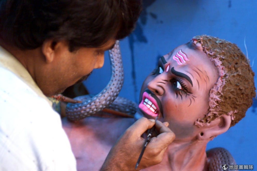 一名印度的雕塑家正在彩繪印度教節慶所需要的惡魔雕像。