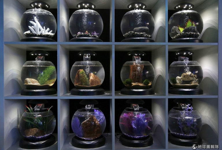 各式各樣的魚缸展示在倫敦的「四面寧靜」(Tetra Tranquility)店面。