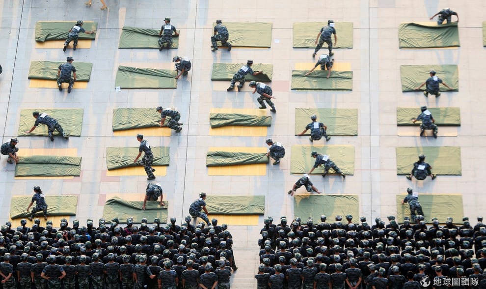 湖南省衡陽市剛開學的大學生們正在進行一系列軍事訓練,照片中他們正在進行折棉被比賽。