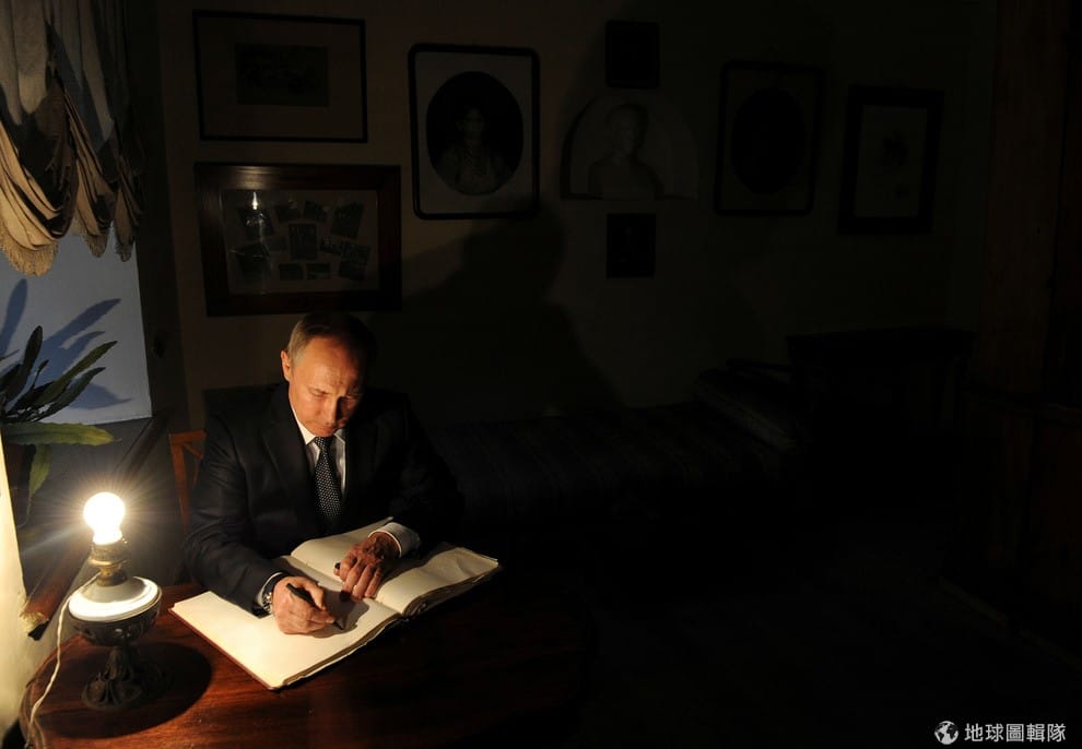 俄國總統普亭(Vladimir Putin)在托爾斯泰紀念館(Leo Tolstoy estate museum)的旅客來訪簿上簽名。