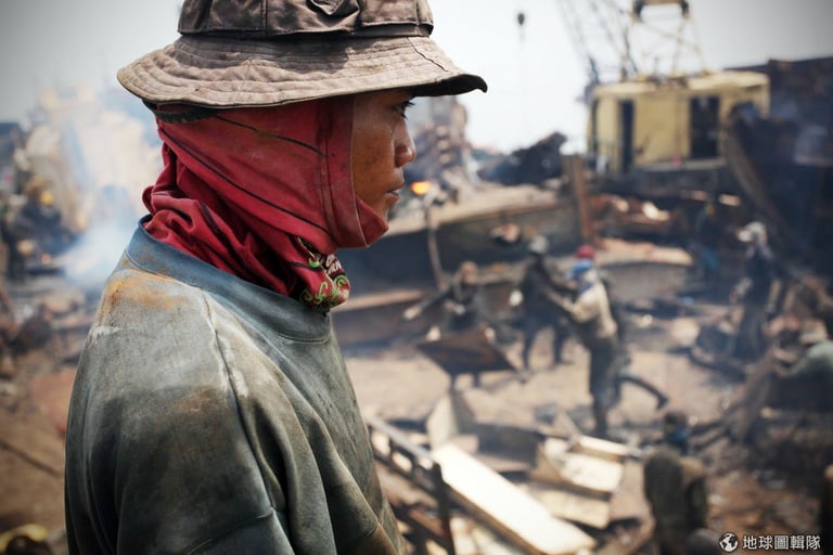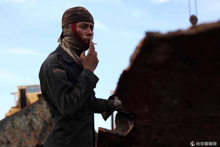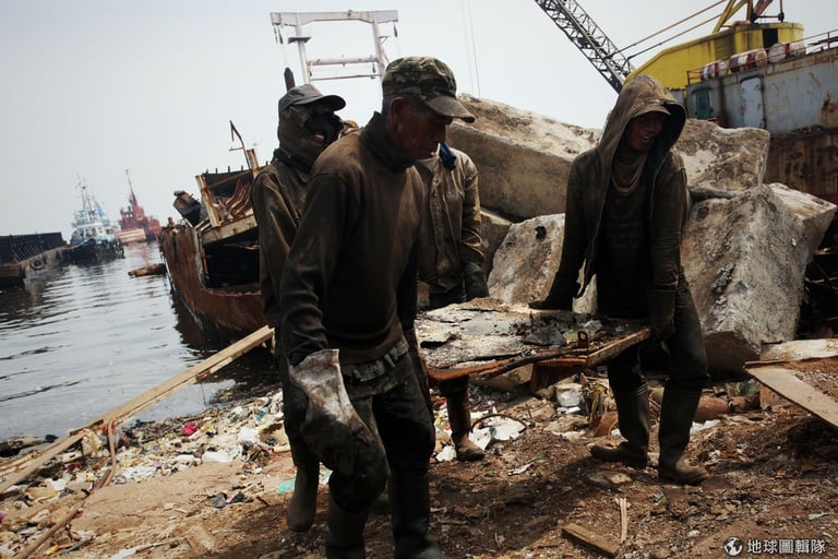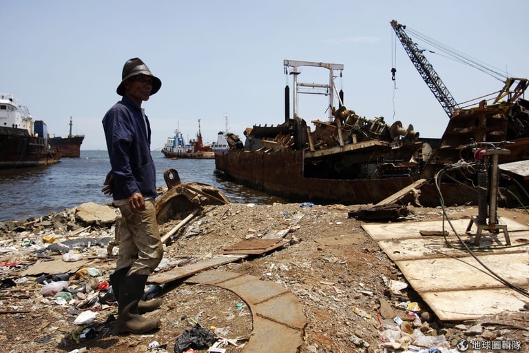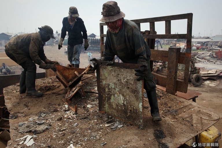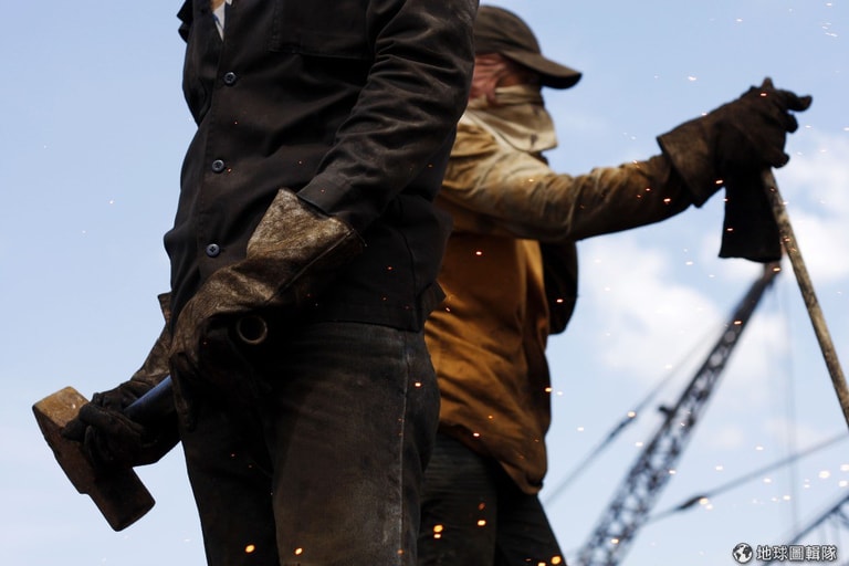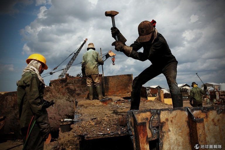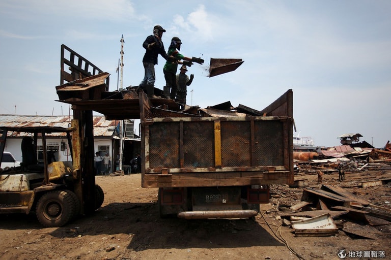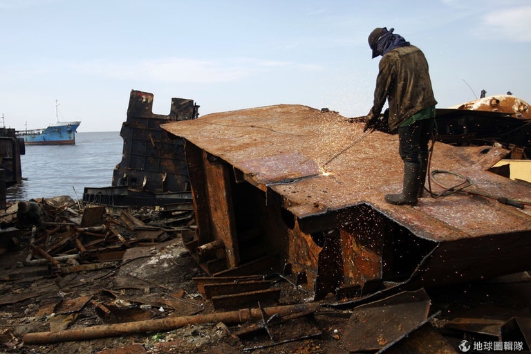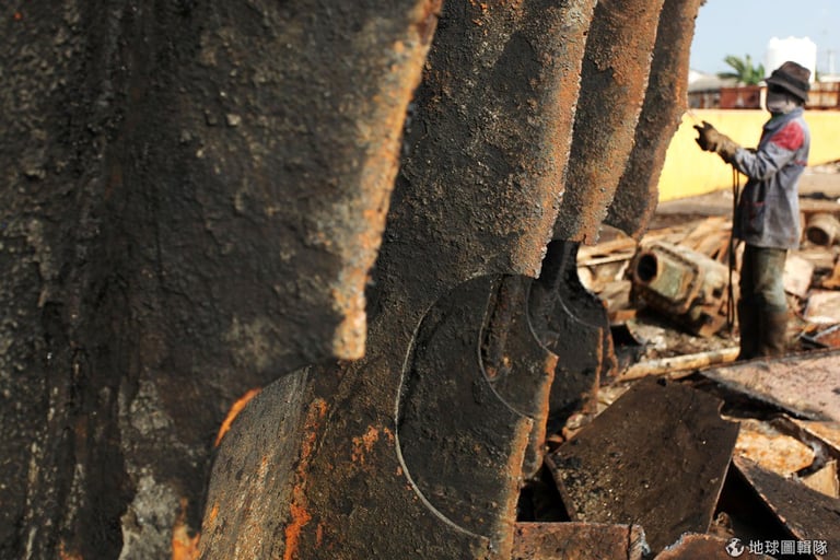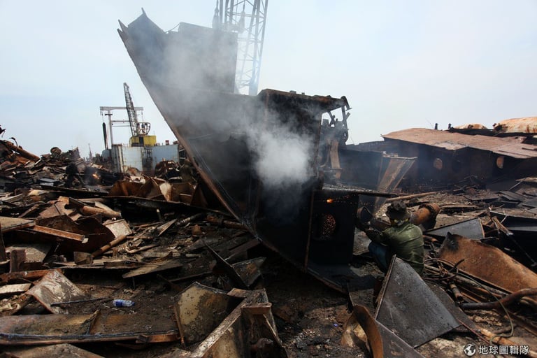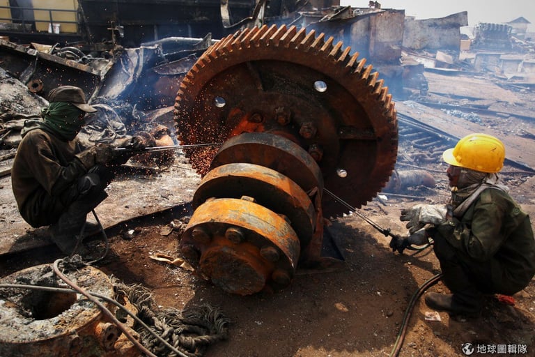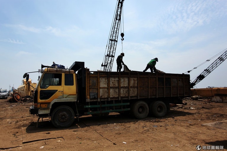無數的鋼鐵塊被運到附近,這時拆卸工人就會用水刀和火槍把大塊的鋼鐵塊切成約60-150公分,適合丟進鎔爐中的大小。至於還有再利用價值的馬達、管線等等,會再被轉賣出去。
